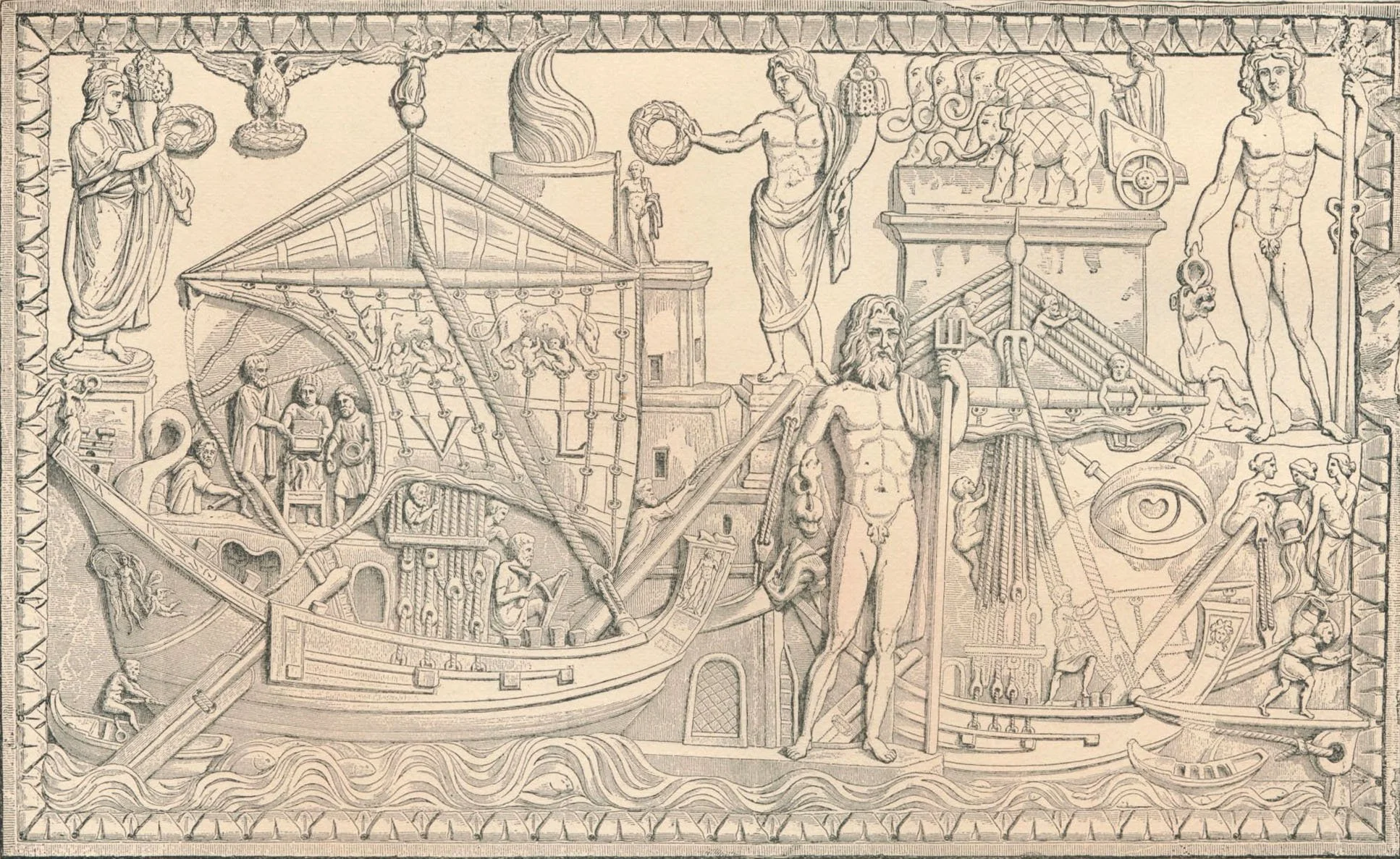 “Bas-relief showing the Claudian Harbor,” an illustration from Ancient Rome in the Light of Recent Excavations by Rodolfo Lanciani, published in 1889 by Houghton Mifflin and Company. Lanciani (1845-1929) was an Italian archaeologist best know for his map of the ancient city of Rome, which he called the Forma Urbis Romae. The map consists of a series of 46 maps, each 25 by 36 inches, issued between 1893 and 1901, and is still widely consulted today.