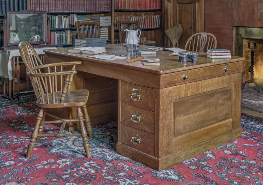 NOTE: Two more partners desks were discovered in storage at The Rocks, when Frances Glessner Lee’s two surviving children were preparing to donate the property to the Society for the Protection of New Hampshire Forests in 1978. One is identical to Lee’s desk, so is no doubt the matching desk made in 1901 for her brother George, who would have moved it to The Rocks when he took up permanent residence there in 1915. The other desk is larger and was most likely made for the Glessners’ use in their home at The Rocks, known simply as the “Big House.” Both houses were demolished in the 1940s, at which time the desks would have been put in storage. Those two desks are now being used by descendants of Frances Glessner Lee.